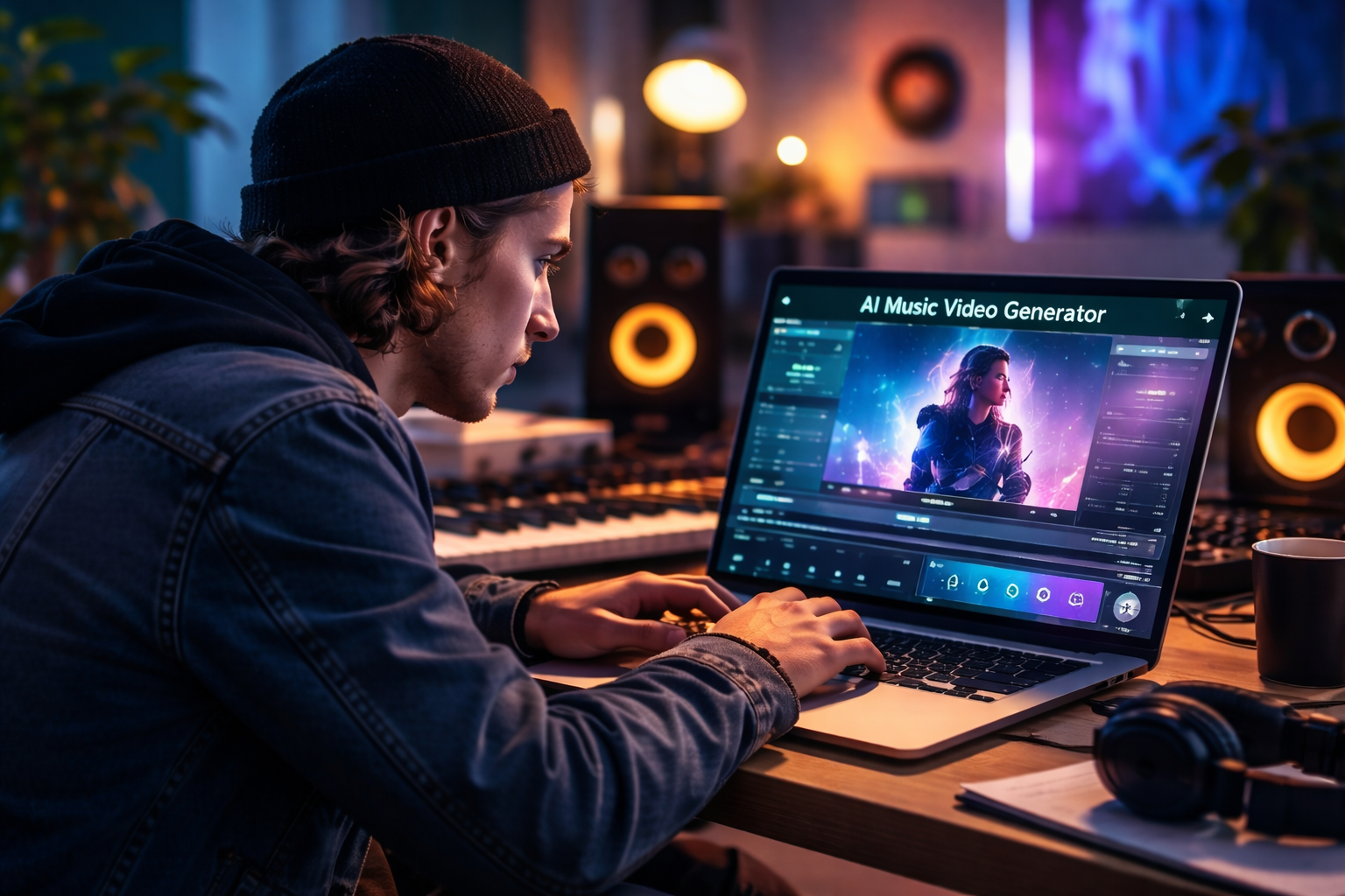 Indie musician creating a music video on a laptop using AI video generation software in a home studio