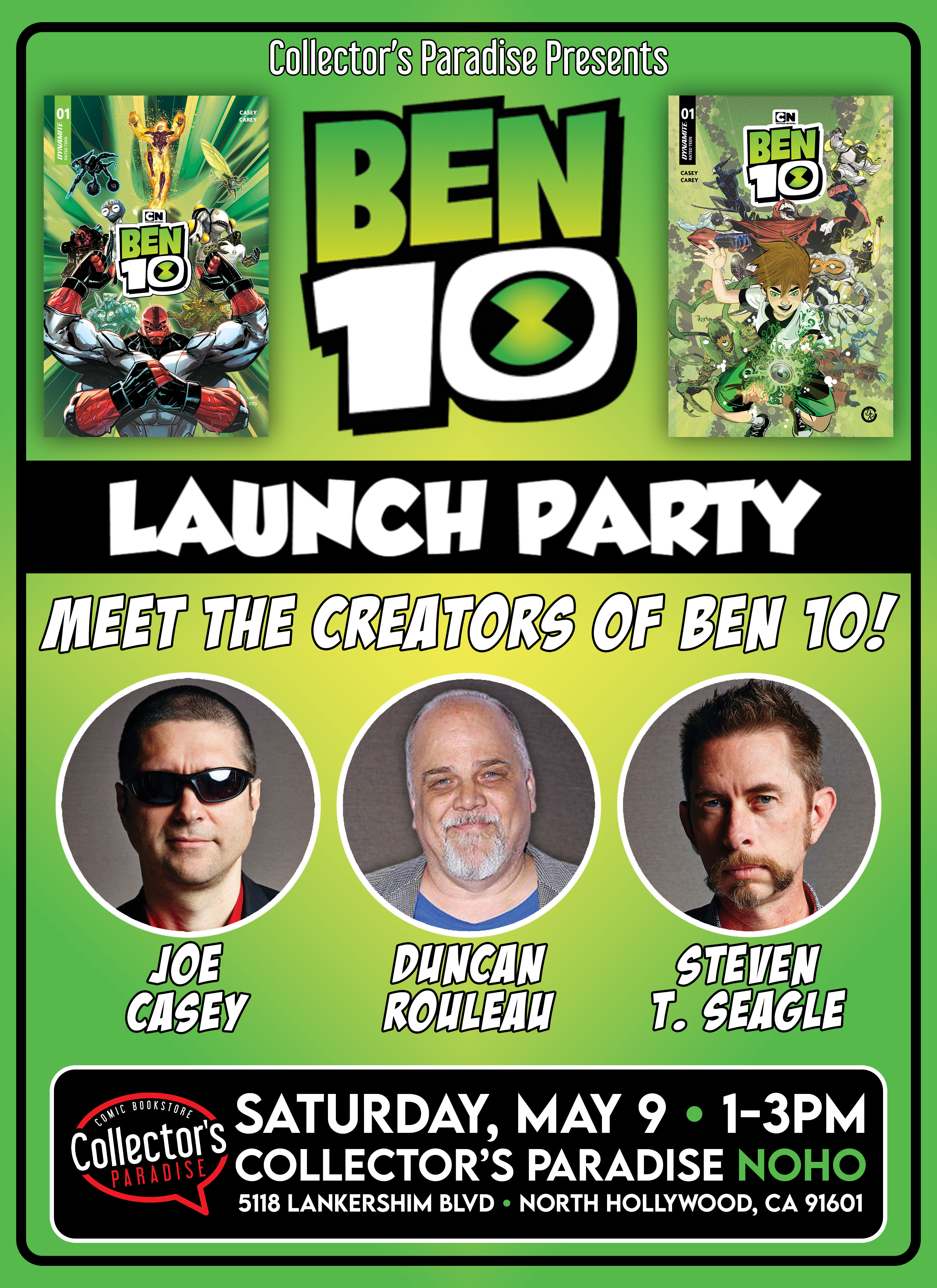 Join us on Saturday, May 9 at Collector’s Paradise North Hollywood to celebrate the release of the new BEN 10 comic book series with the original series creators: JOE CASEY, DUNCAN ROULEAU and STEVEN T. SEAGLE!