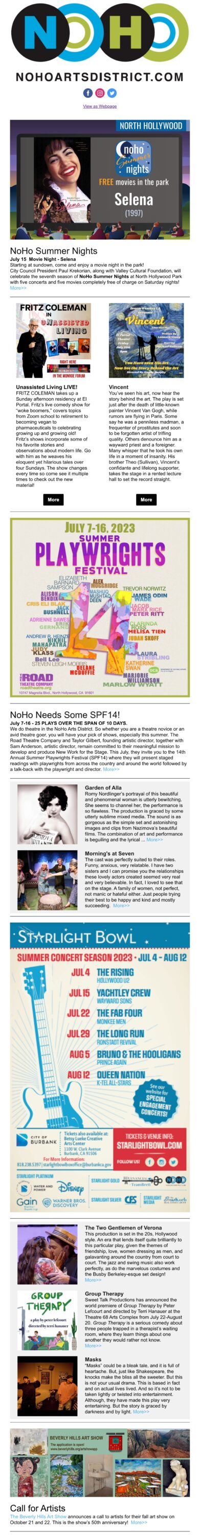 NoHo News for July 13: NoHo Summer Nights -Selena. Starlight Bowl. SPF14! Summer Playwrights Festival. Theatre! Vincent. Fritz Coleman. THEATRE REVIEWS. Call to Artists. #KeepNoHoArtsy