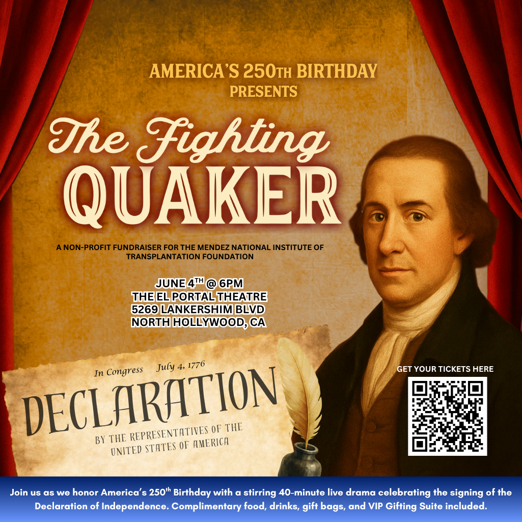 [NoHo Arts District, CA] – Producers Suzanne Matlack DeLaurentiis, Dale Fabrigar, and Nicole Mendez announce the production of The Fighting Quaker, a landmark theatrical event celebrating America’s 250th anniversary, on Thursday, June 4 at the iconic El Portal Theatre.
