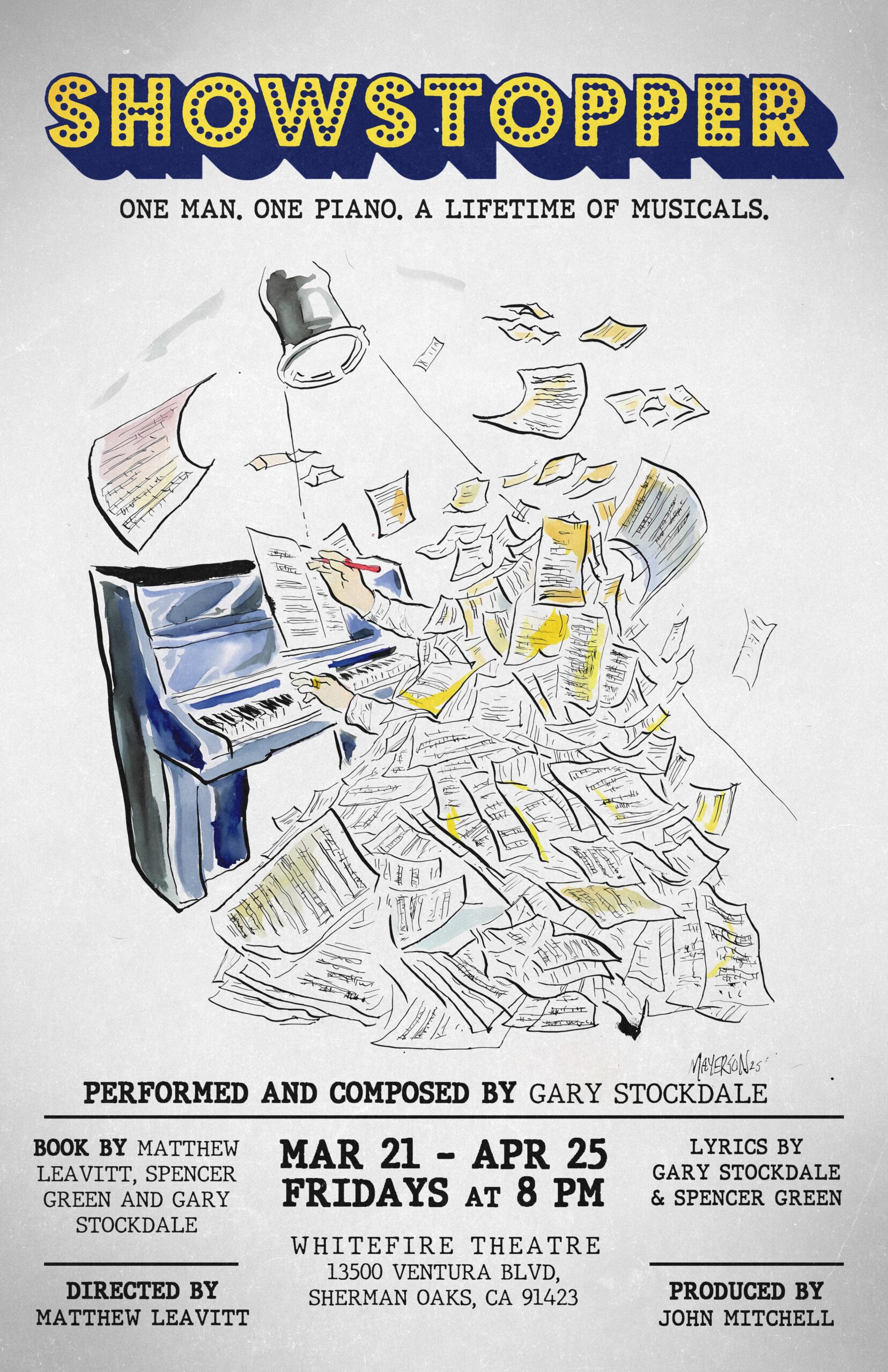 Showstopper is a one-person show which follows Jerry as he discusses his life and career to an “audience” at New York’s 92Y Theatre. He details the ups and downs, successes and failures, and everything that he sacrificed in his quest to become the Next Big Thing as a musical composer on Broadway.